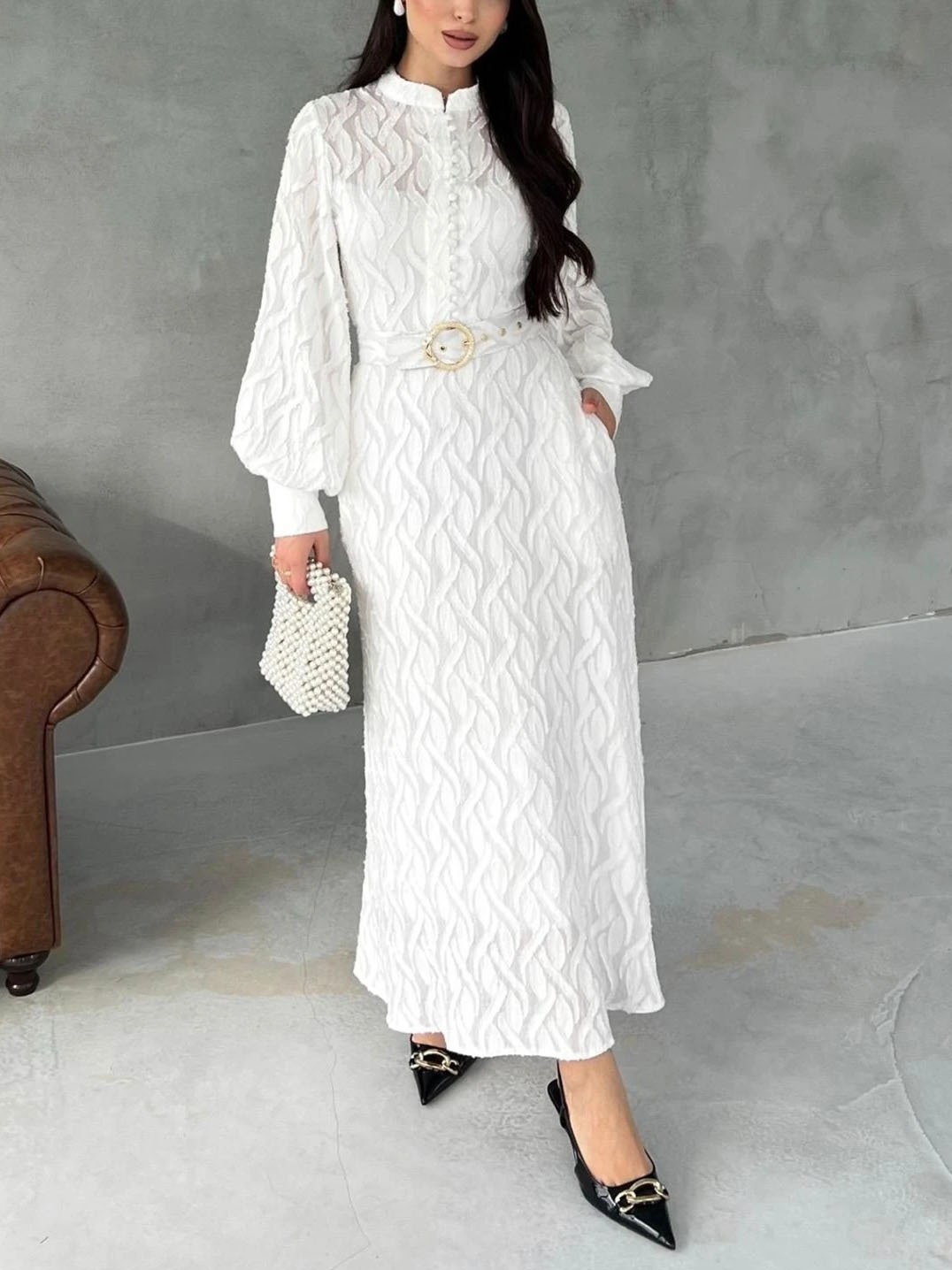 This elegant floor-length dress is crafted from exquisite jacquard fabric and features a matching belt to accentuate the waistline. Its flowing silhouette and refined texture lend it a timeless elegance, making it versatile enough for both everyday wear and special occasions.