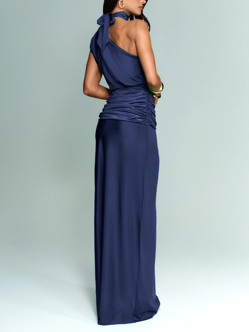 Elegant Asymmetrical Neckline Pleated Maxi Dress
