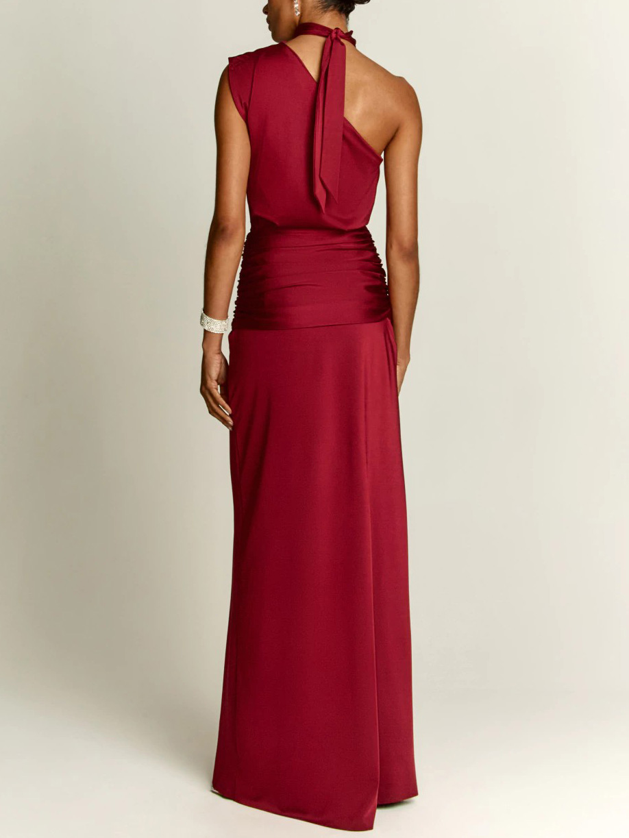 Deze jurk heeft een elegante één-schouderontwerp met een vloeiende geplooide rok, gemaakt van een lichtgewicht en ademende stof, waardoor het perfect is voor avond evenementen, bruiloften of verfijnde feestgelegenheden.