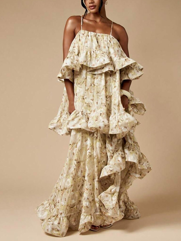 An elegant maxi dress featuring delicate floral prints, adjustable spaghetti straps, and multiple cascading ruffle layers for a voluminous yet graceful silhouette. The lightweight fabric and flowing design make it a perfect choice for summer occasions, beachside gatherings, or romantic evenings.