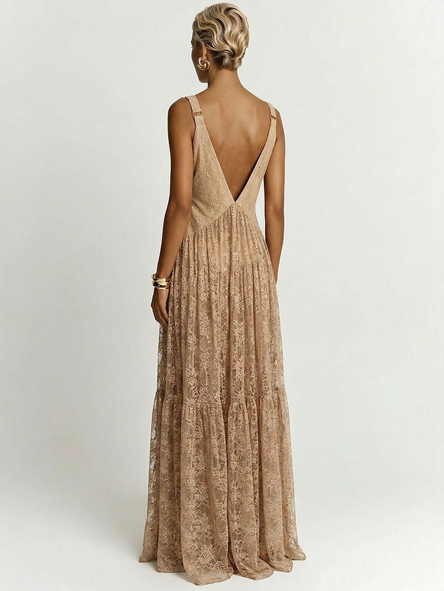 Elegant Lace Deep V-neck Tulle Maxi Dress