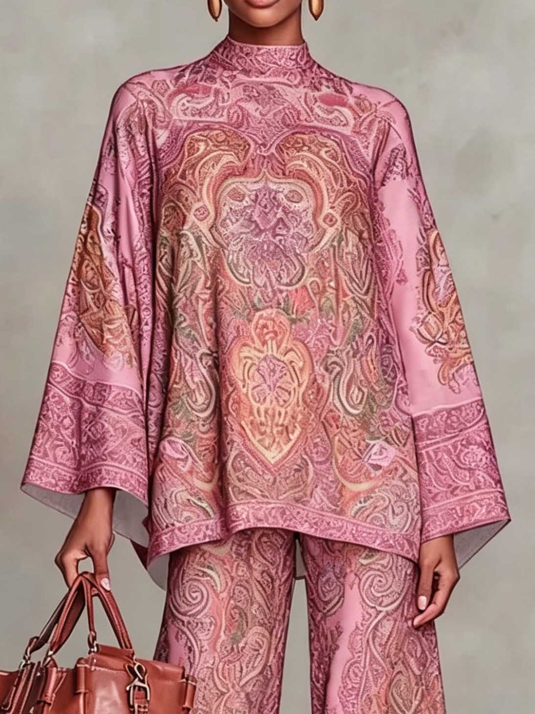 Elegant Satin Paisley Print Batwing Sleeve Two-Piece Set