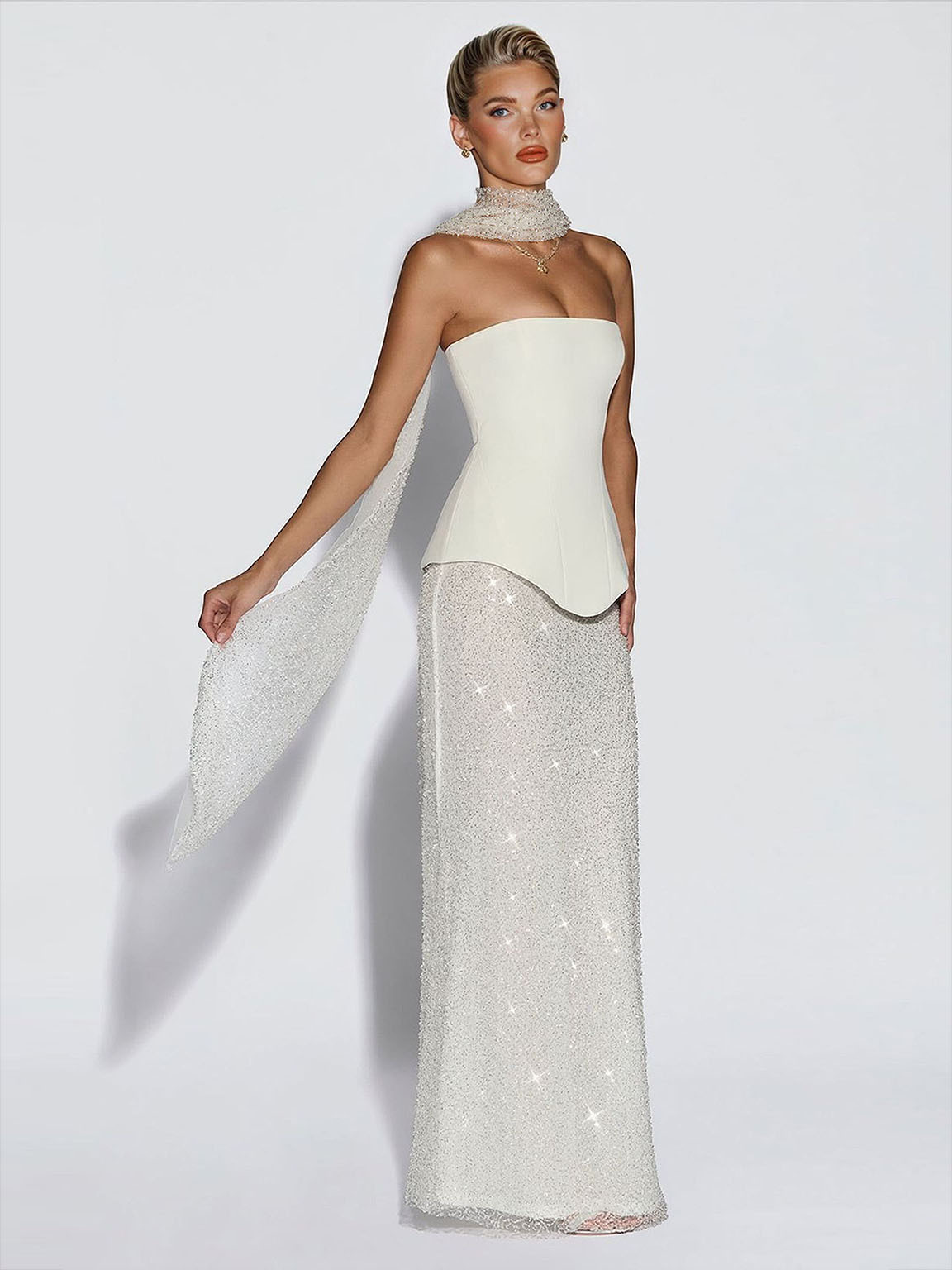 This elegant set features a strapless corset top paired with a shimmering sequin skirt and a delicate beaded shawl. Designed to enhance your silhouette with refined sparkle, it’s perfect for formal events, galas, and special occasions.