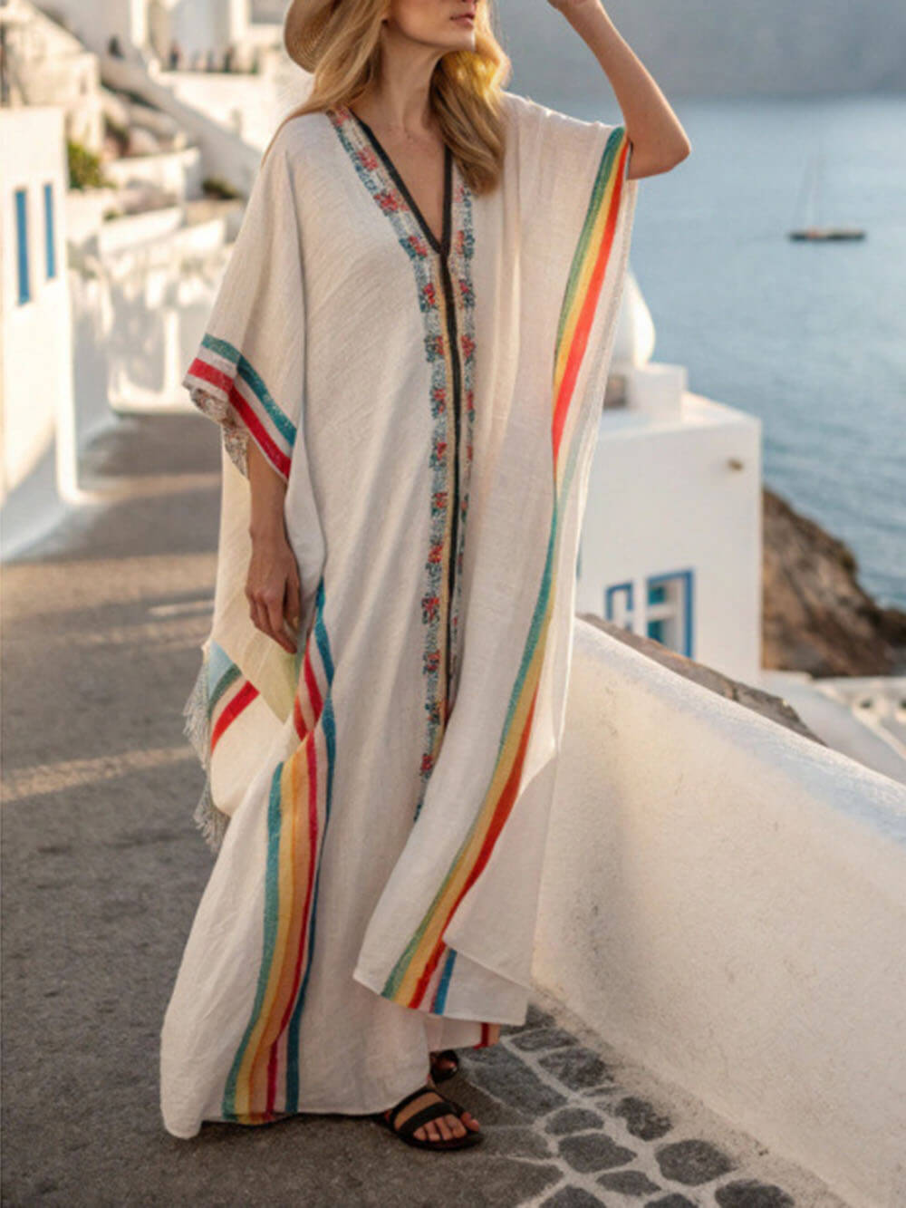 Bohemian Striped Print Off-Shoulder Half Sleeve Kimono Maxi Dress