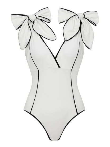 Chic meets playful in this striking black and white one-piece swimsuit. Designed with a bold colorblock contrast and a feminine bow detail, it perfectly balances elegance and allure for a standout swim look. Perfect for beach vacations, poolside lounging, and resort getaways.