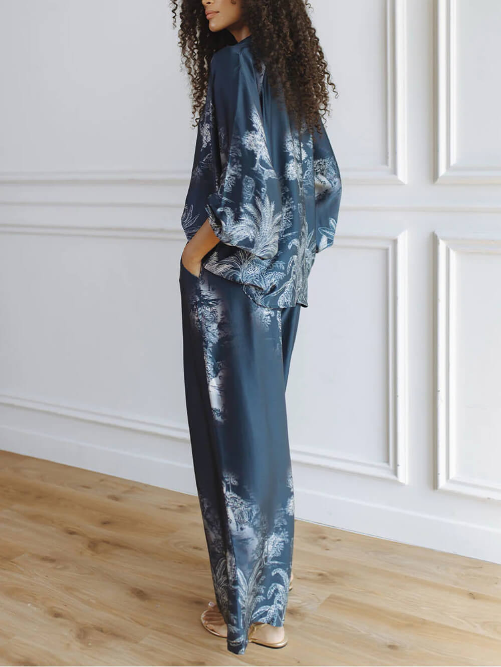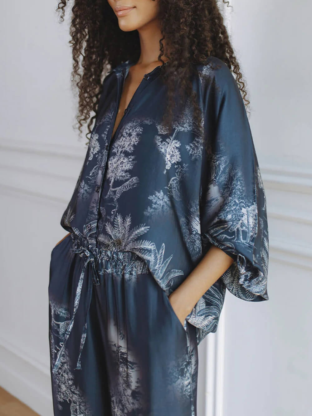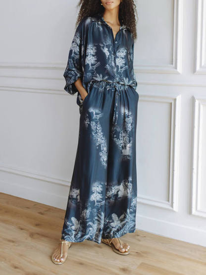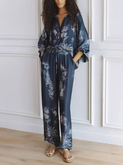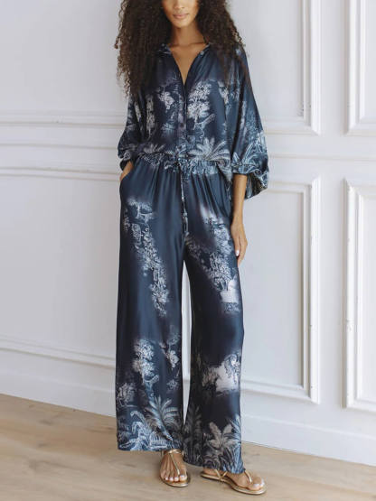 Unique Navy Blue Floral Print Loose-fitting Top with Elastic Waist and Wide-leg Pants Set