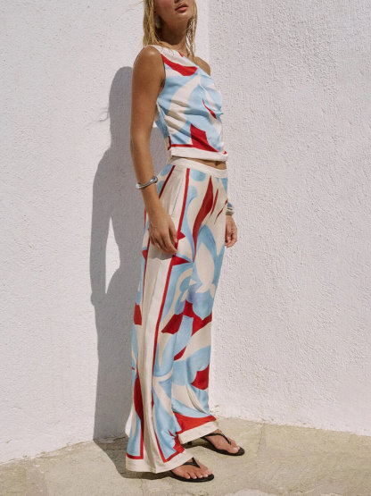 Unique Printed One-Shoulder Tie Top And Elastic Waist Wide Leg Pants Set